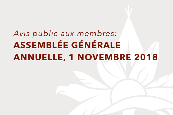 Avis est donné que l’assemblée générale annuelle (l’« assemblée ») de l’Association touristique autochtone du Canada (la « société ») aura lieu au Sheraton Cavalier Hotel, 612 Spadina Cres E, à Saskatoon, Saskatchewan, jeudi le 1er novembre 2018 à 9h00 (heure locale) aux fins suivantes :